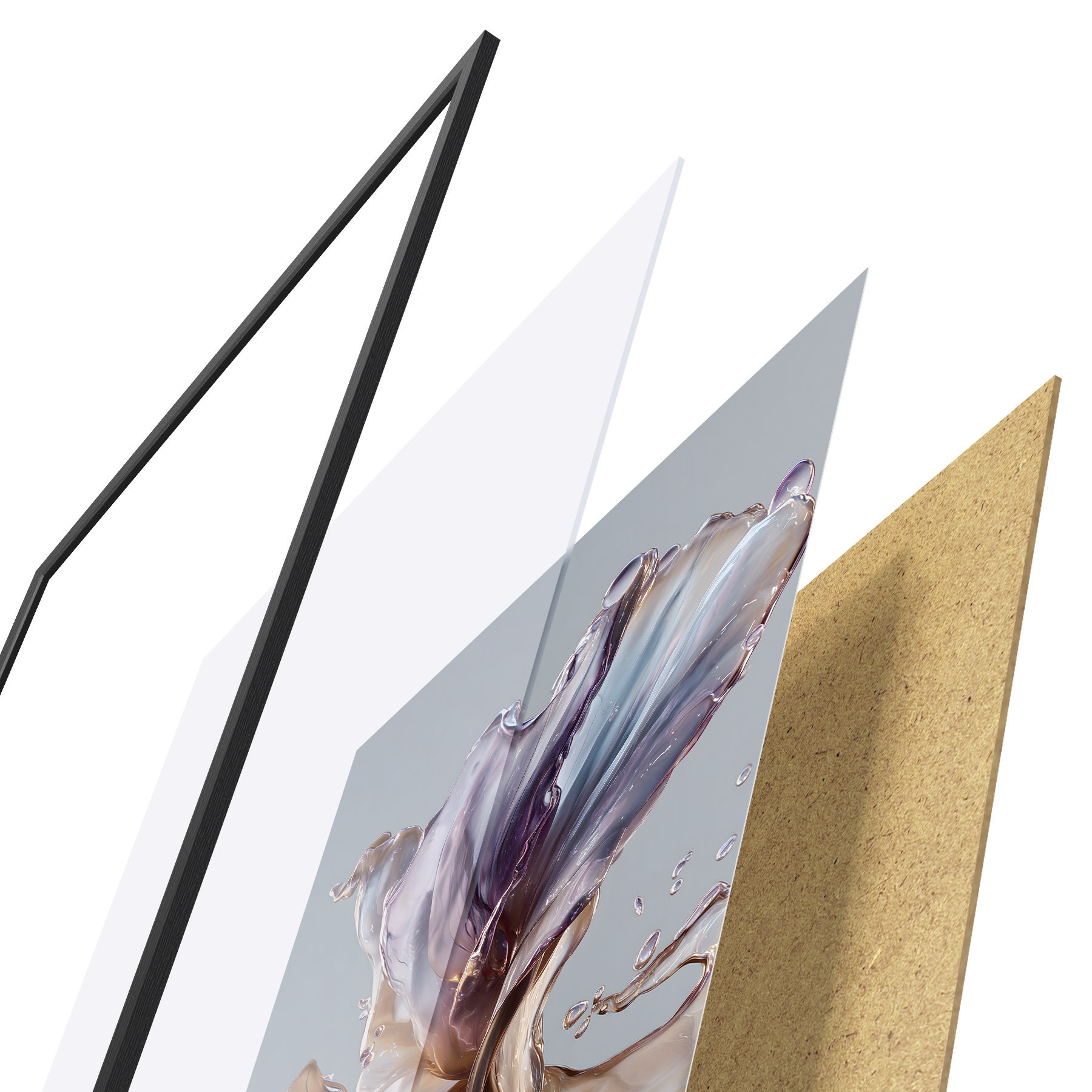 Plakat składa się z ramy, pleksi, wydrukowanego obrazu i podkładu z płyty wiórowej. Plakat można natychmiast zawiesić na ścianie dzięki uchwytom z tyłu.