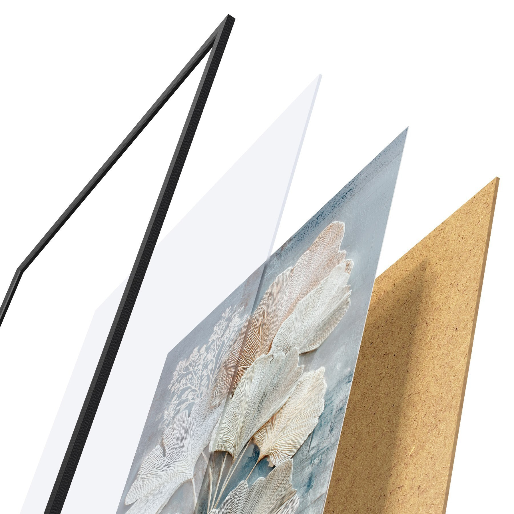 Plakat składa się z ramy, pleksi, wydrukowanego obrazu i podkładu z płyty wiórowej. Plakat można natychmiast zawiesić na ścianie dzięki uchwytom z tyłu.