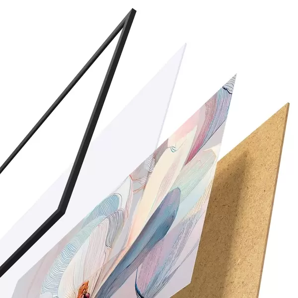 Plakat składa się z ramy, pleksi, wydrukowanego obrazu i podkładu z płyty wiórowej. Plakat można natychmiast zawiesić na ścianie dzięki uchwytom z tyłu.