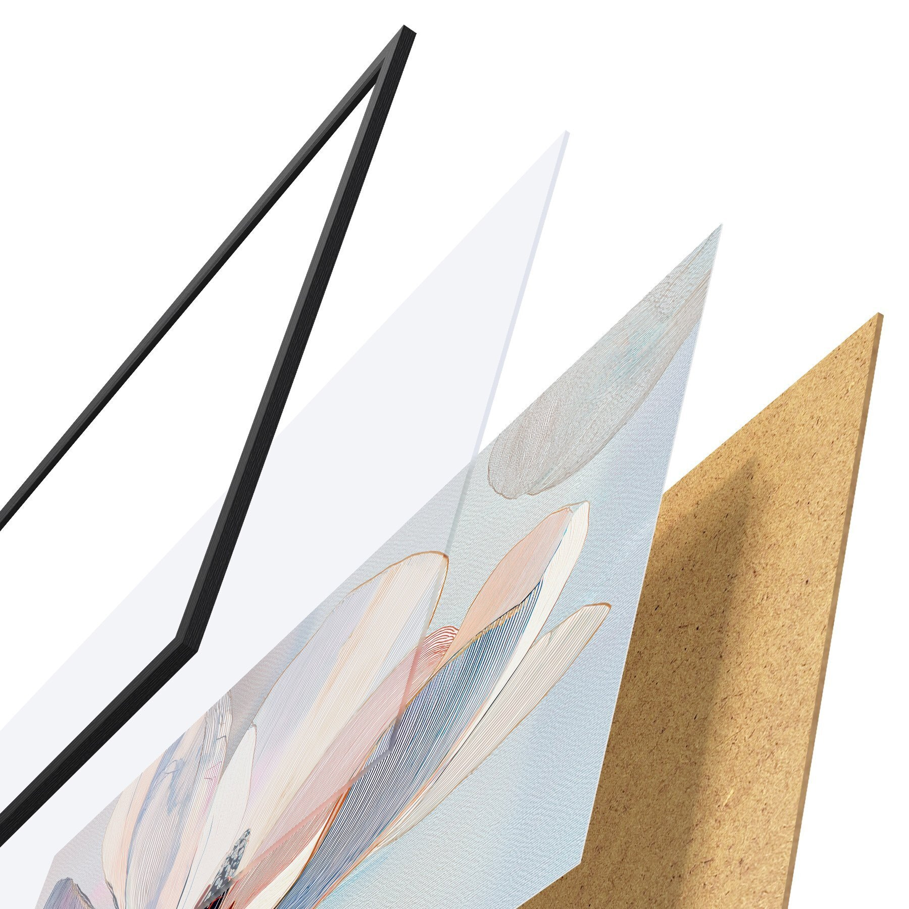 Plakat składa się z ramy, pleksi, wydrukowanego obrazu i podkładu z płyty wiórowej. Plakat można natychmiast zawiesić na ścianie dzięki uchwytom z tyłu.