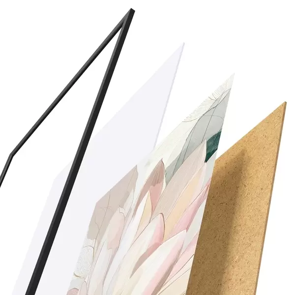 Plakat składa się z ramy, pleksi, wydrukowanego obrazu i podkładu z płyty wiórowej. Plakat można natychmiast zawiesić na ścianie dzięki uchwytom z tyłu.