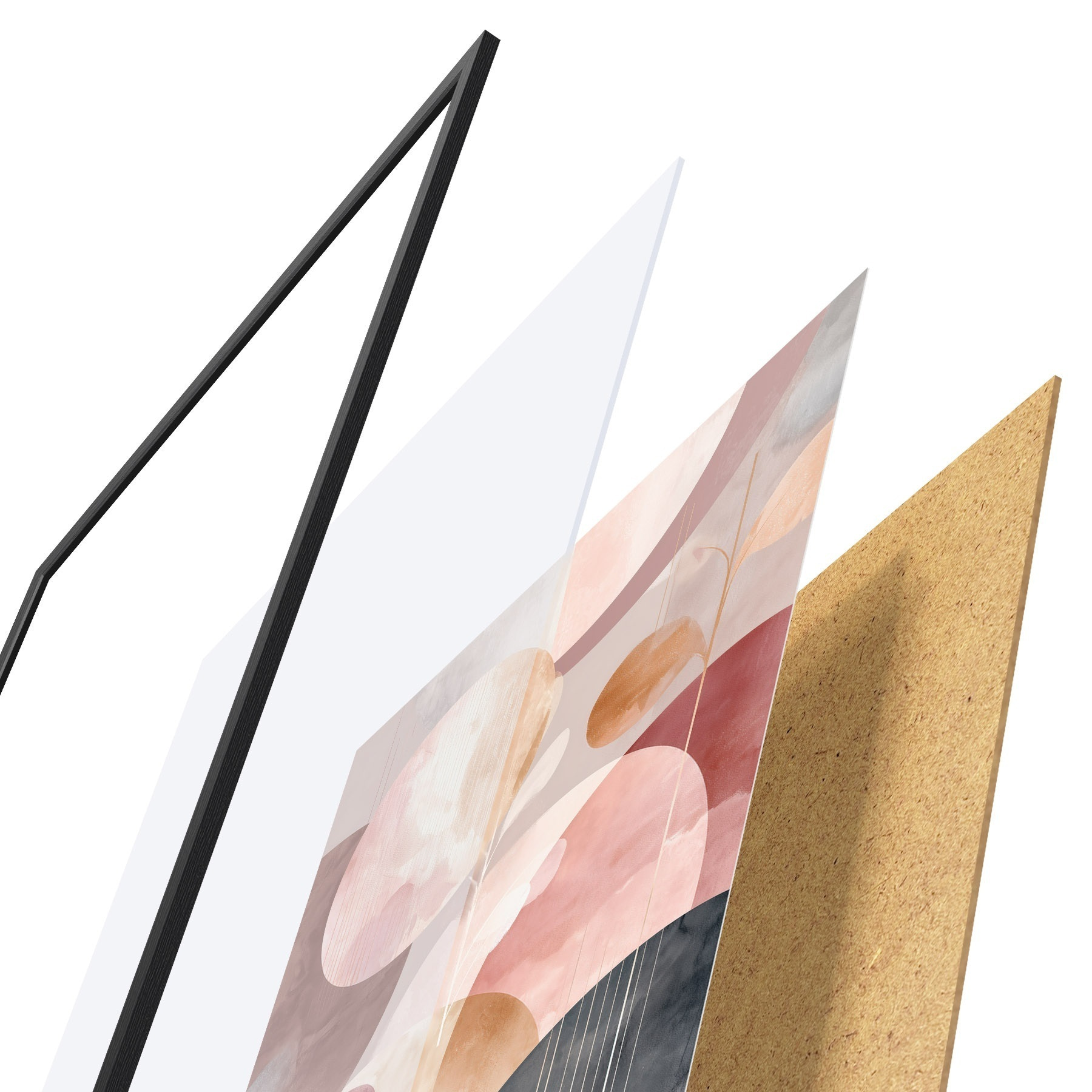Plakat składa się z ramy, pleksi, wydrukowanego obrazu i podkładu z płyty wiórowej. Plakat można natychmiast zawiesić na ścianie dzięki uchwytom z tyłu.