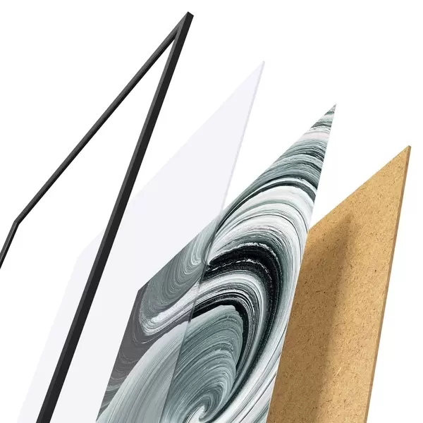 Plakat składa się z ramy, pleksi, wydrukowanego obrazu i podkładu z płyty wiórowej. Plakat można natychmiast zawiesić na ścianie dzięki uchwytom z tyłu.