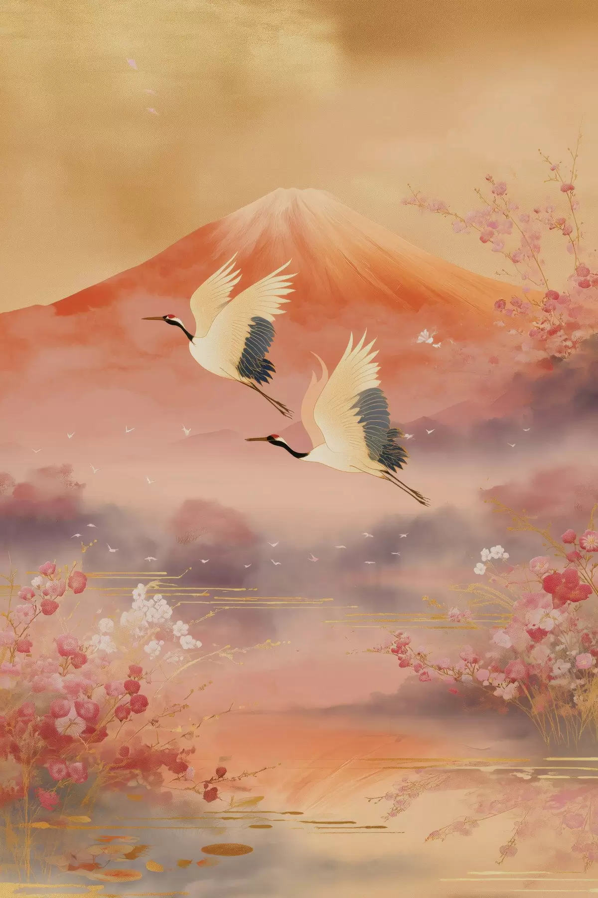 Poster Tradycyjny motyw wschodni z kwiatami wiśni i żurawiami Nr f47991