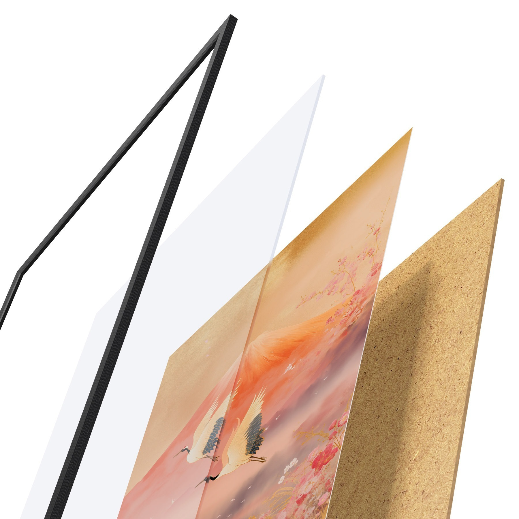 Plakat składa się z ramy, pleksi, wydrukowanego obrazu i podkładu z płyty wiórowej. Plakat można natychmiast zawiesić na ścianie dzięki uchwytom z tyłu.