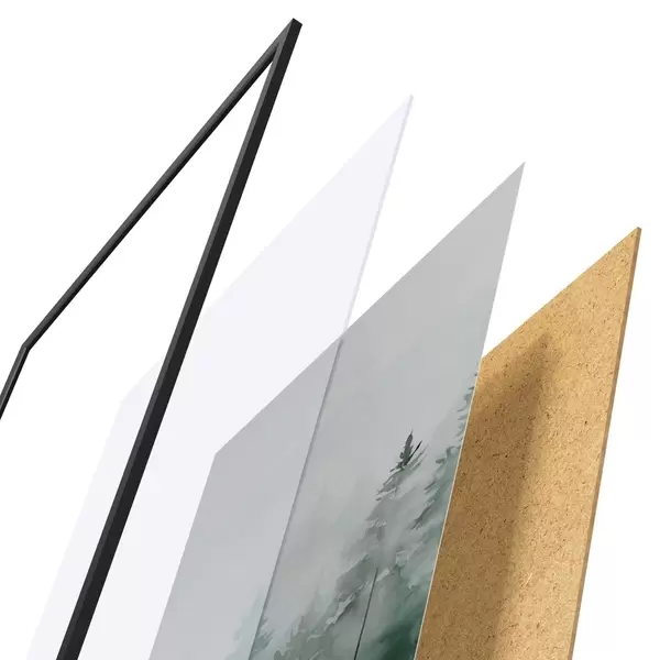 Plakat składa się z ramy, pleksi, wydrukowanego obrazu i podkładu z płyty wiórowej. Plakat można natychmiast zawiesić na ścianie dzięki uchwytom z tyłu.
