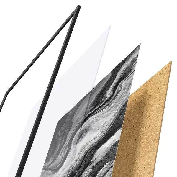 Plakat składa się z ramy, pleksi, wydrukowanego obrazu i podkładu z płyty wiórowej. Plakat można natychmiast zawiesić na ścianie dzięki uchwytom z tyłu.