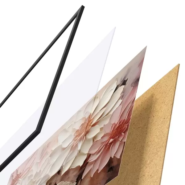 Plakat składa się z ramy, pleksi, wydrukowanego obrazu i podkładu z płyty wiórowej. Plakat można natychmiast zawiesić na ścianie dzięki uchwytom z tyłu.