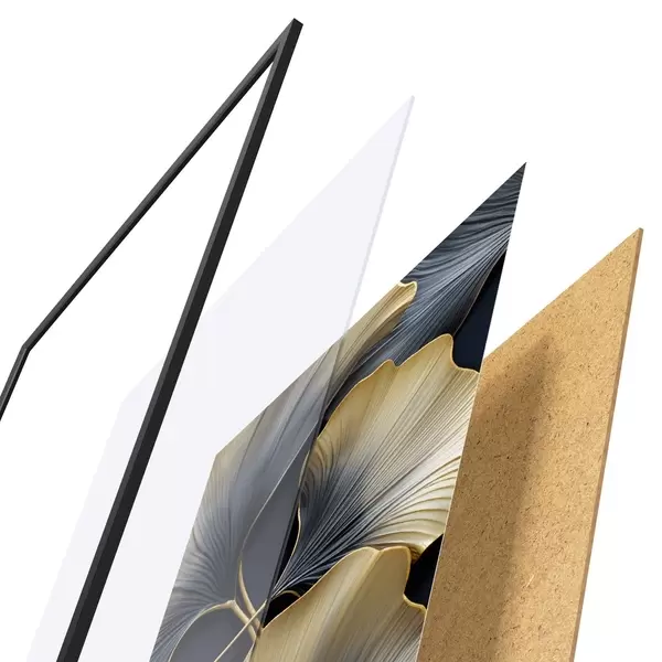 Plakat składa się z ramy, pleksi, wydrukowanego obrazu i podkładu z płyty wiórowej. Plakat można natychmiast zawiesić na ścianie dzięki uchwytom z tyłu.
