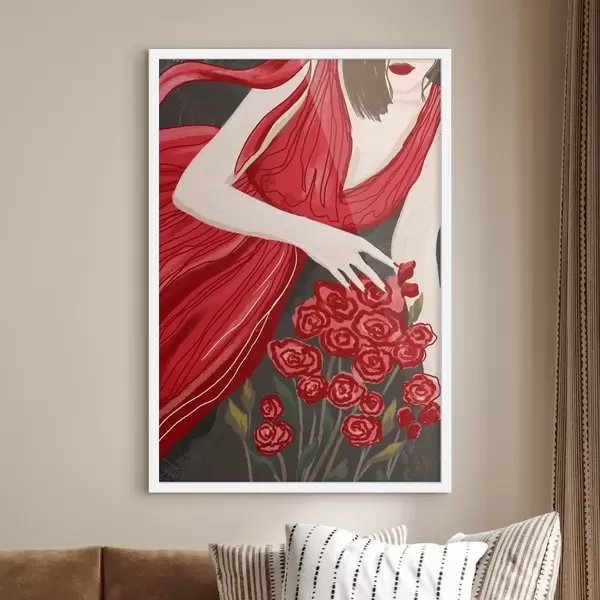 Plakat Kobieta w czerwonej sukience z bukietem róż f48026
