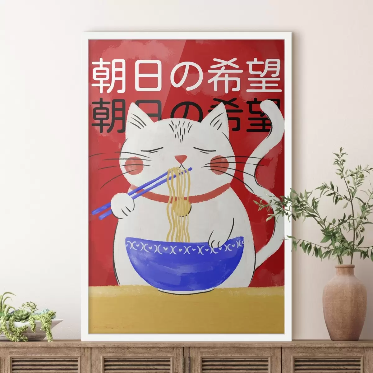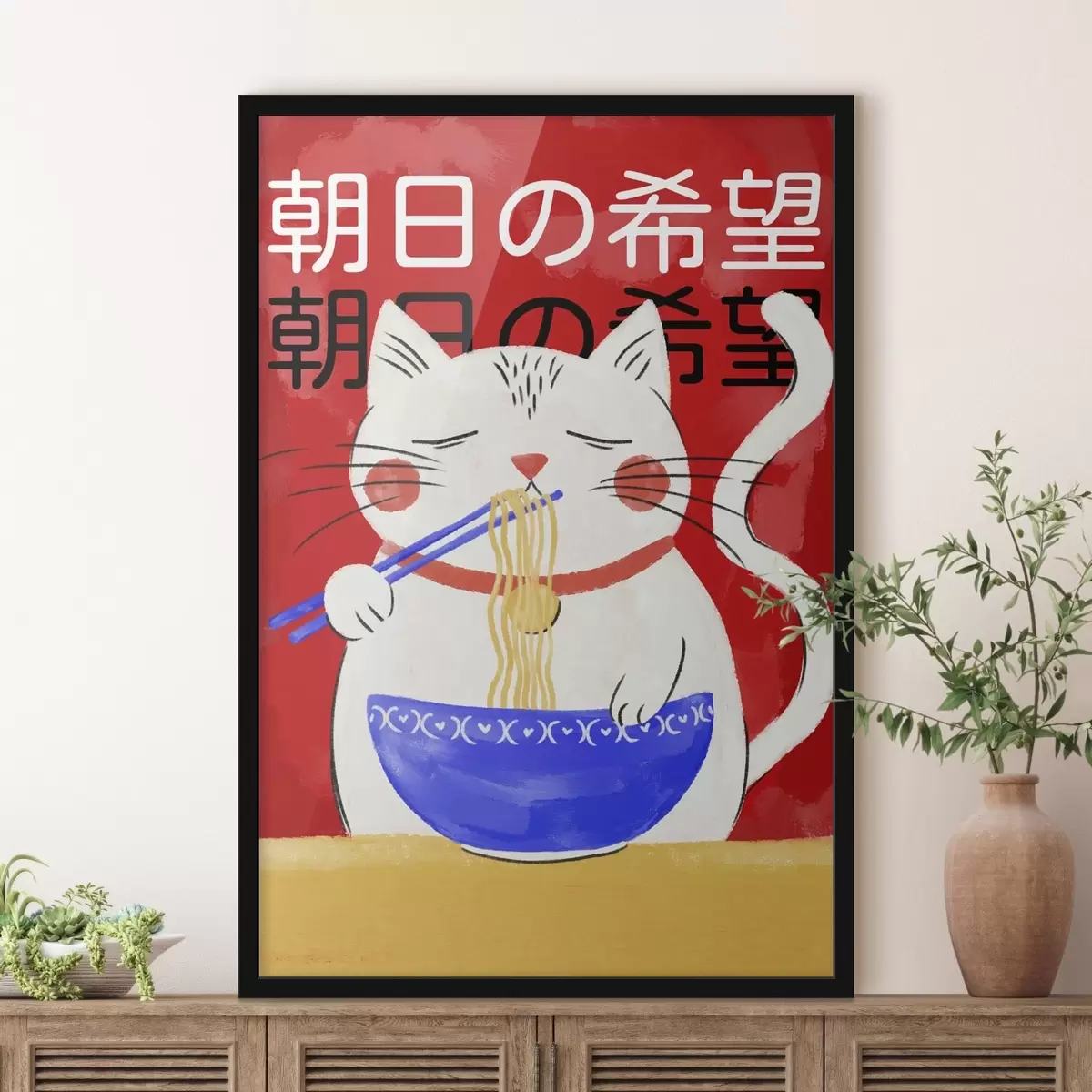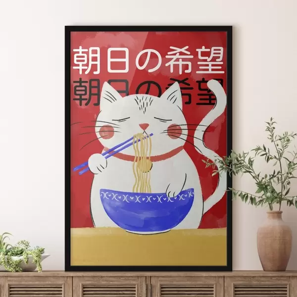 Plakat Ilustracja przedstawiająca kota jedzącego makaron na czerwonym tle f48031