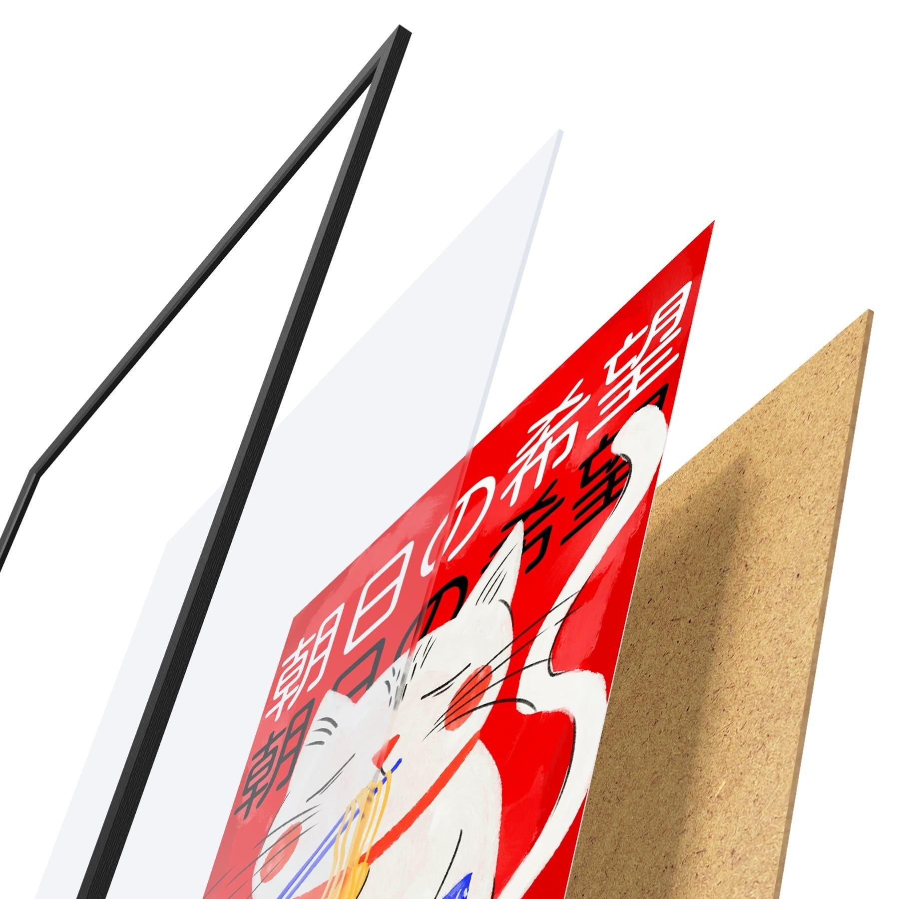 Plakat składa się z ramy, pleksi, wydrukowanego obrazu i podkładu z płyty wiórowej. Plakat można natychmiast zawiesić na ścianie dzięki uchwytom z tyłu.