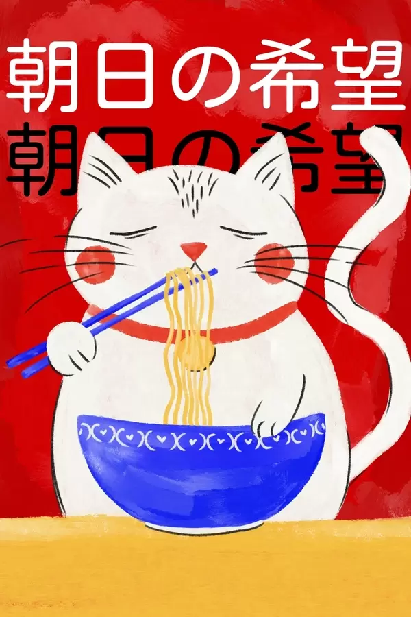 Plakat Ilustracja przedstawiająca kota jedzącego makaron na czerwonym tle f48031