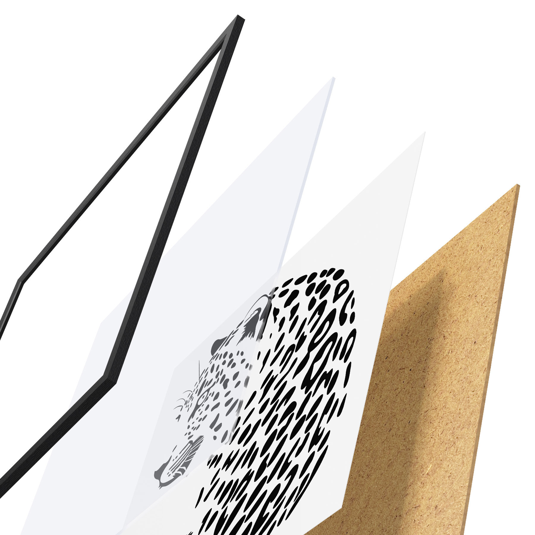 Plakat składa się z ramy, pleksi, wydrukowanego obrazu i podkładu z płyty wiórowej. Plakat można natychmiast zawiesić na ścianie dzięki uchwytom z tyłu.