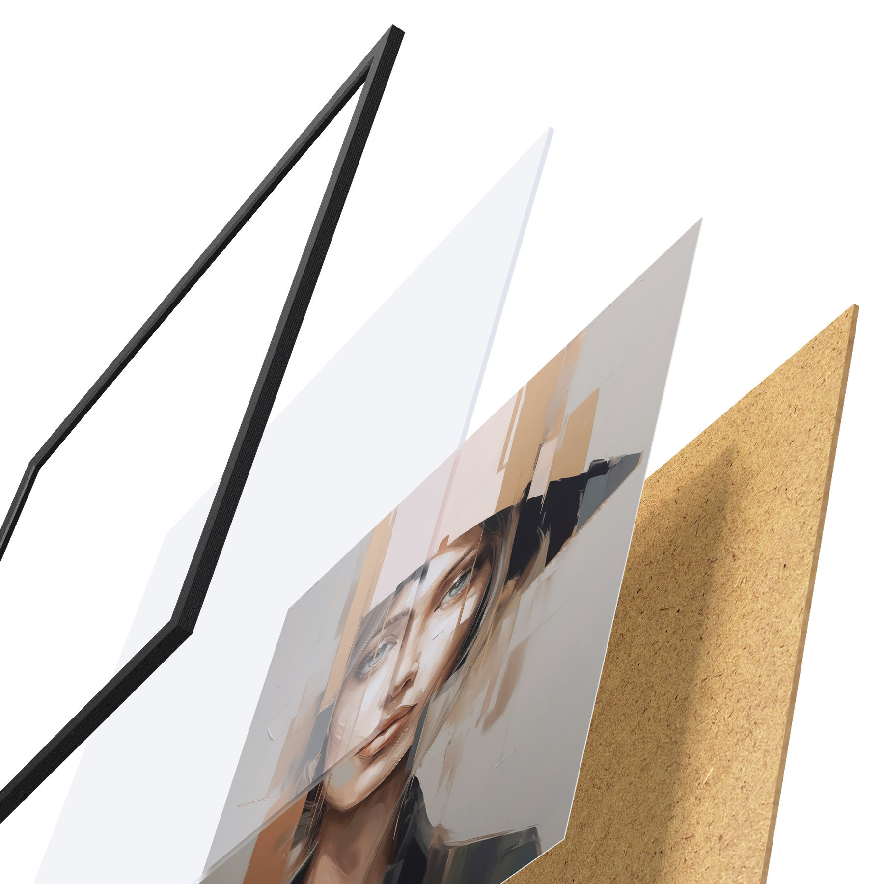 Plakat składa się z ramy, pleksi, wydrukowanego obrazu i podkładu z płyty wiórowej. Plakat można natychmiast zawiesić na ścianie dzięki uchwytom z tyłu.