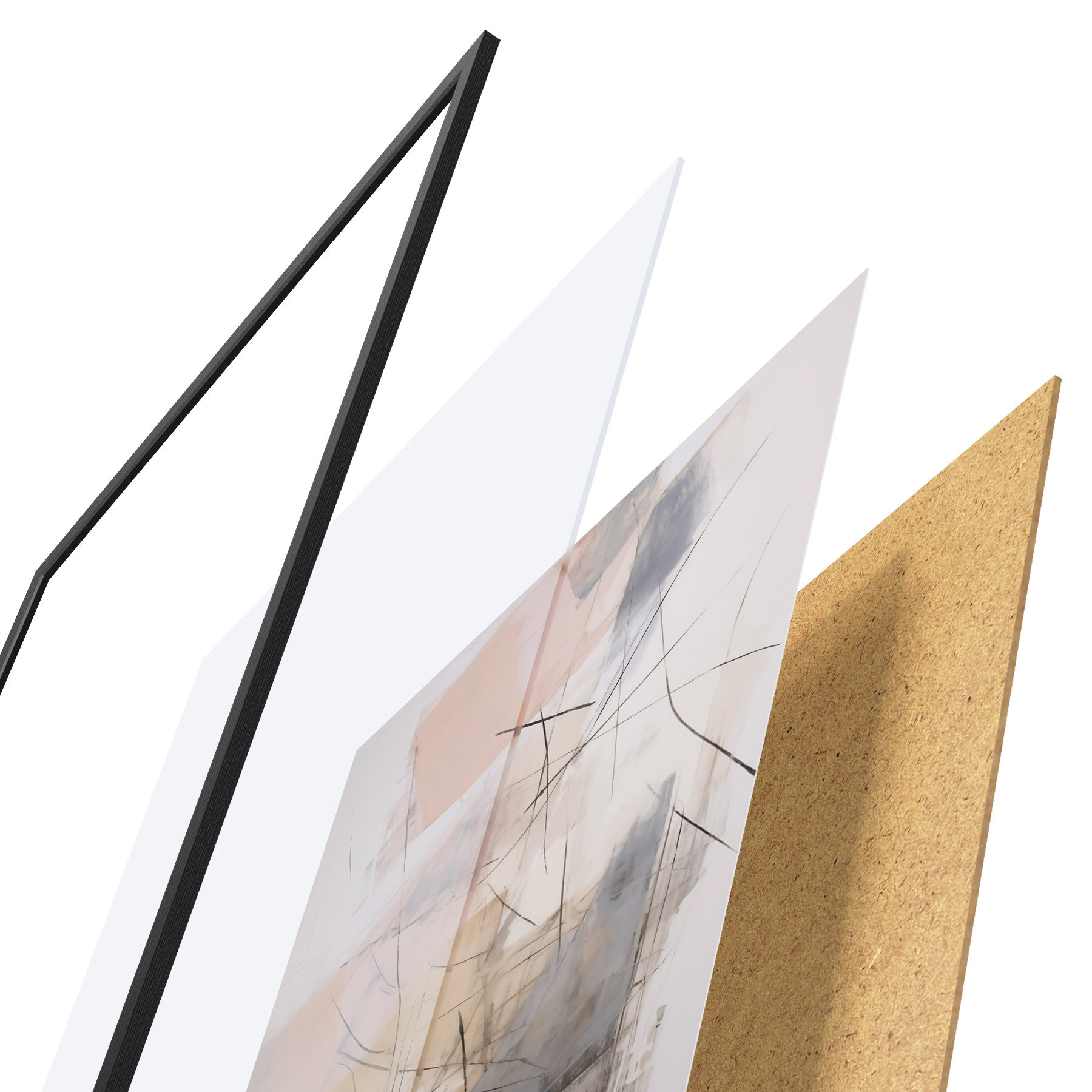 Plakat składa się z ramy, pleksi, wydrukowanego obrazu i podkładu z płyty wiórowej. Plakat można natychmiast zawiesić na ścianie dzięki uchwytom z tyłu.