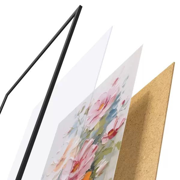 Plakat składa się z ramy, pleksi, wydrukowanego obrazu i podkładu z płyty wiórowej. Plakat można natychmiast zawiesić na ścianie dzięki uchwytom z tyłu.