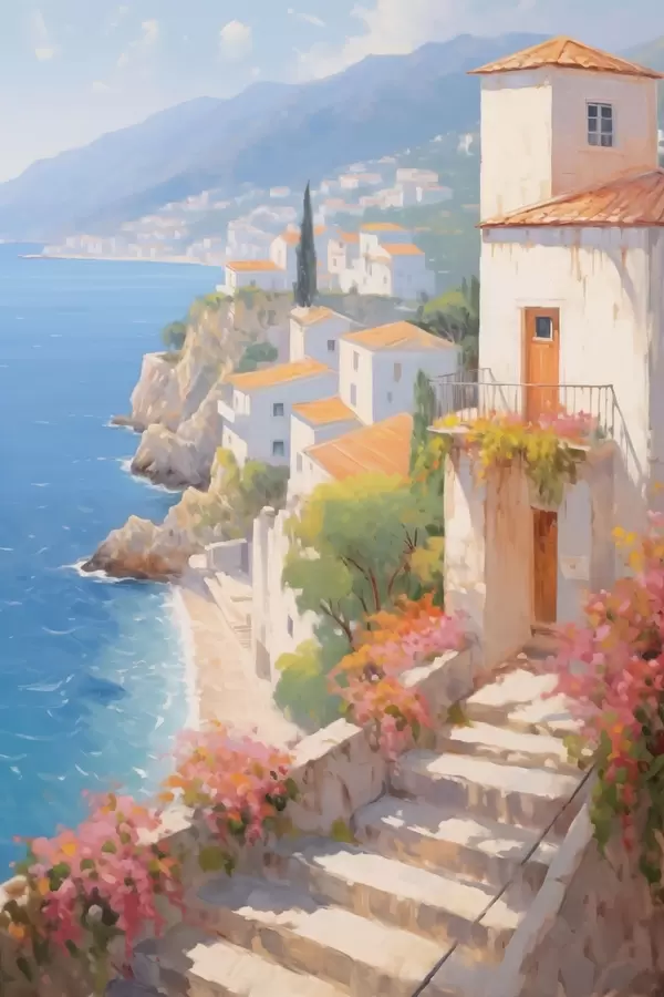 Plakat impresjonistyczna śródziemnomorska wioska na klifie f48060