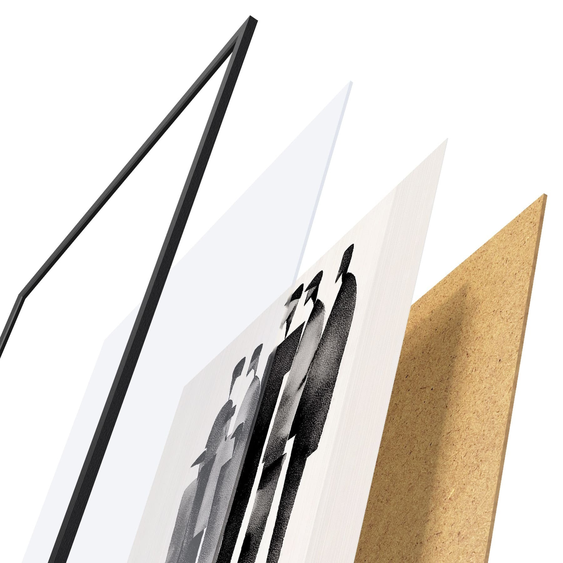 Plakat składa się z ramy, pleksi, wydrukowanego obrazu i podkładu z płyty wiórowej. Plakat można natychmiast zawiesić na ścianie dzięki uchwytom z tyłu.