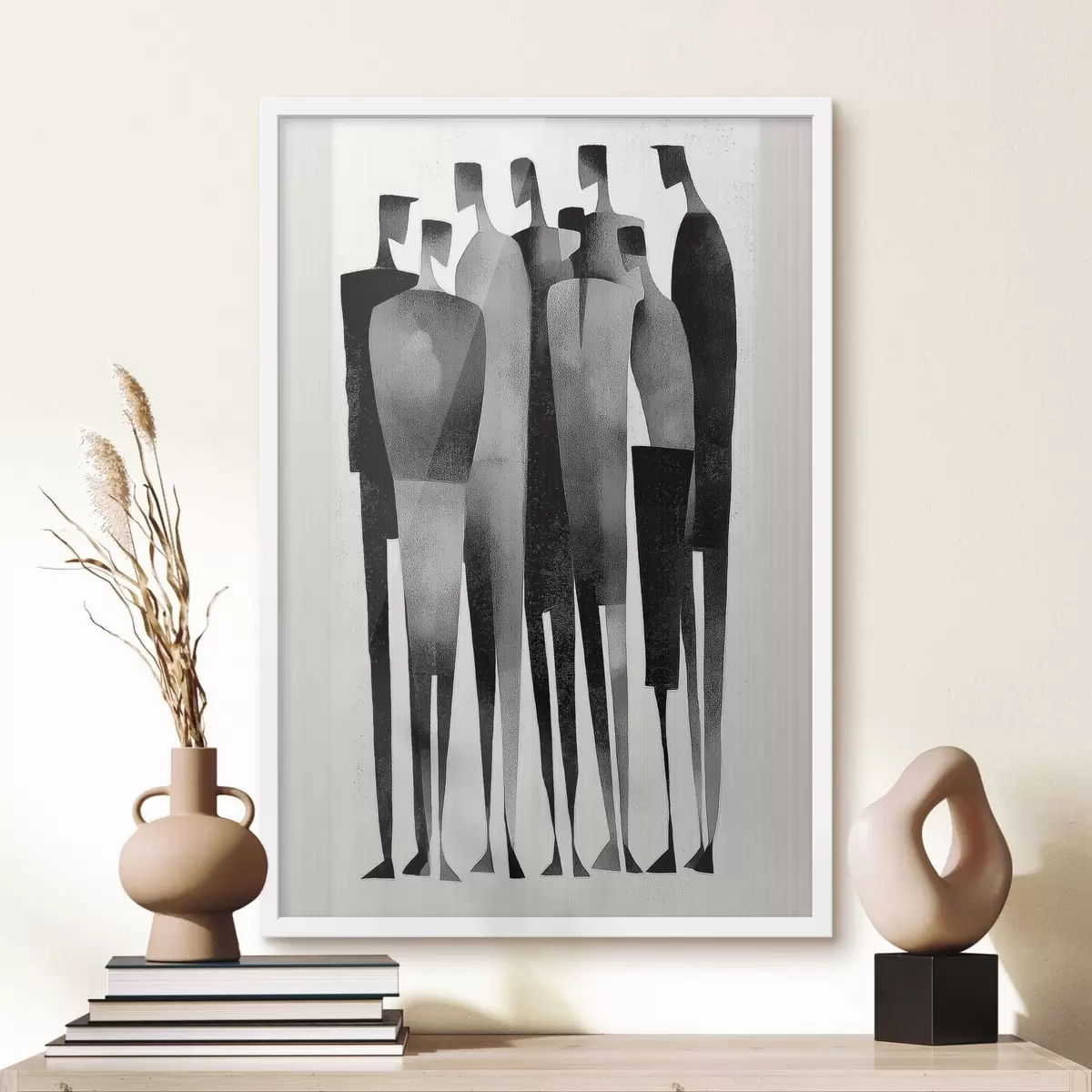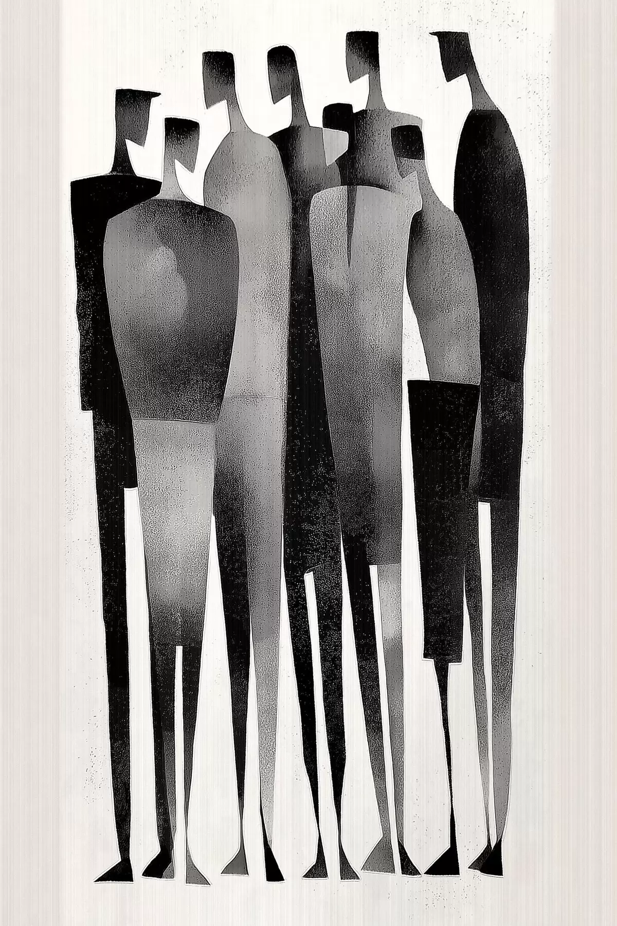 Plakat minimalistyczne, wydłużone postacie ludzkie stojące w rzędzie f48069