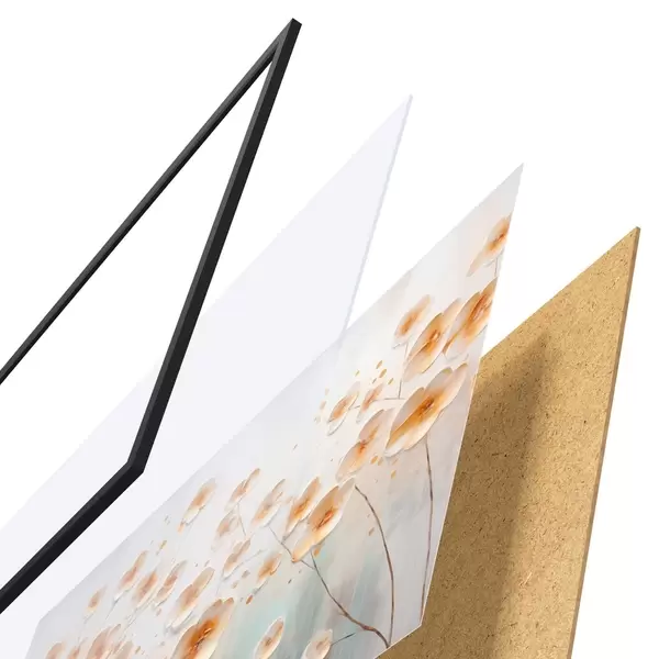 Plakat składa się z ramy, pleksi, wydrukowanego obrazu i podkładu z płyty wiórowej. Plakat można natychmiast zawiesić na ścianie dzięki uchwytom z tyłu.