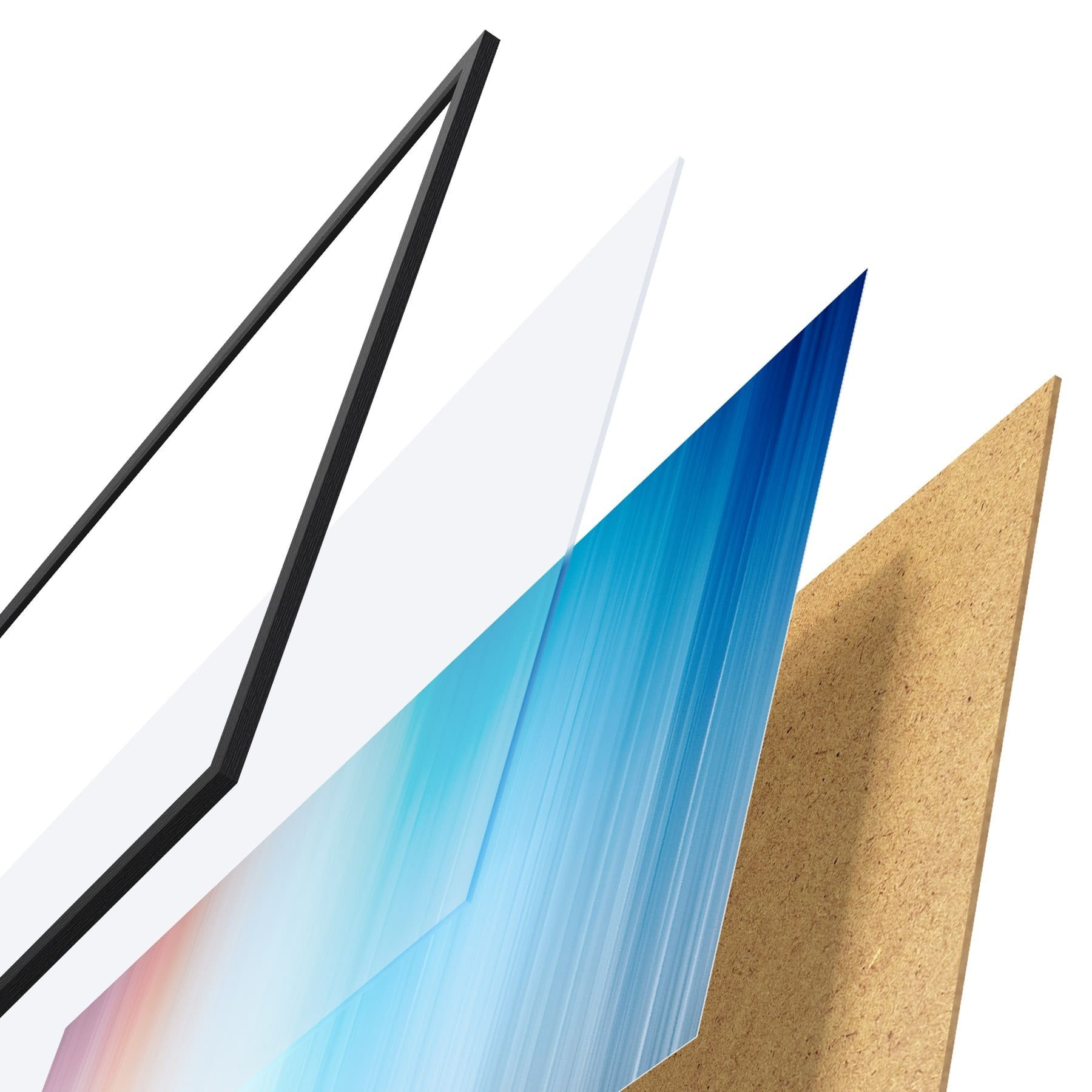 Plakat składa się z ramy, pleksi, wydrukowanego obrazu i podkładu z płyty wiórowej. Plakat można natychmiast zawiesić na ścianie dzięki uchwytom z tyłu.