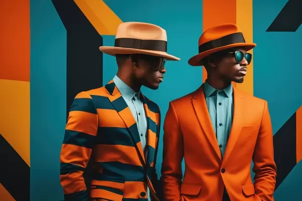 Plakat Dwóch mężczyzn w jasnych garniturach i kapeluszach f48091