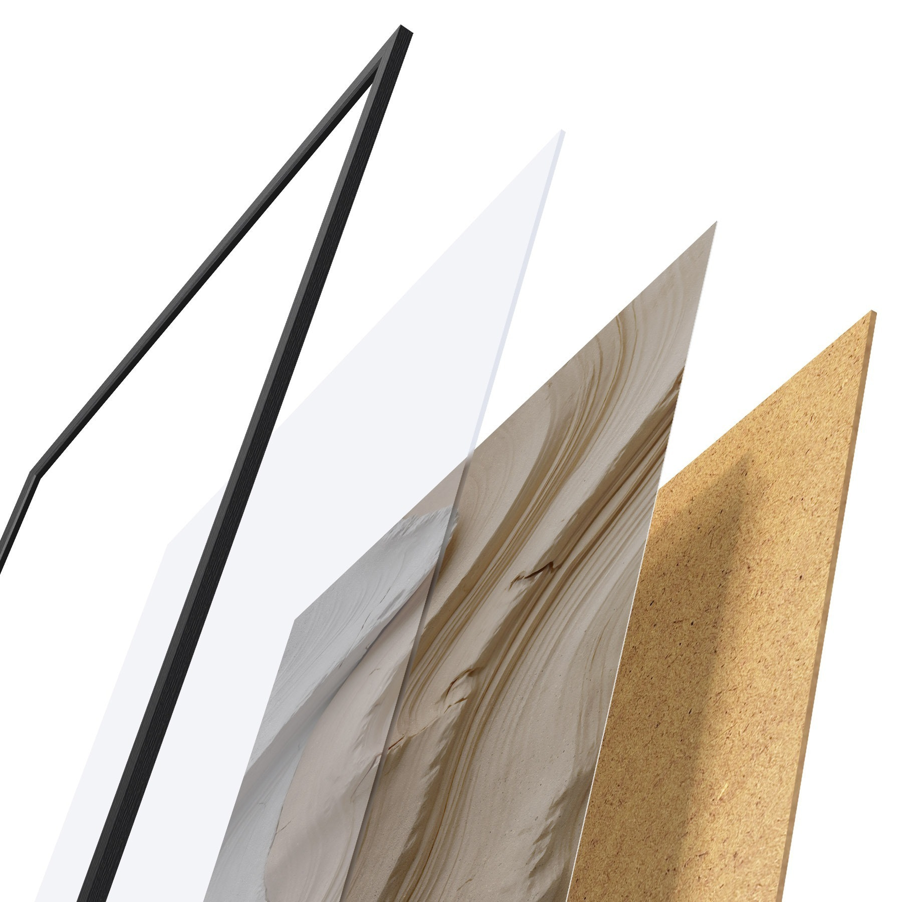 Plakat składa się z ramy, pleksi, wydrukowanego obrazu i podkładu z płyty wiórowej. Plakat można natychmiast zawiesić na ścianie dzięki uchwytom z tyłu.