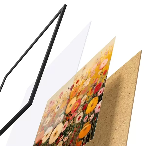 Plakat składa się z ramy, pleksi, wydrukowanego obrazu i podkładu z płyty wiórowej. Plakat można natychmiast zawiesić na ścianie dzięki uchwytom z tyłu.