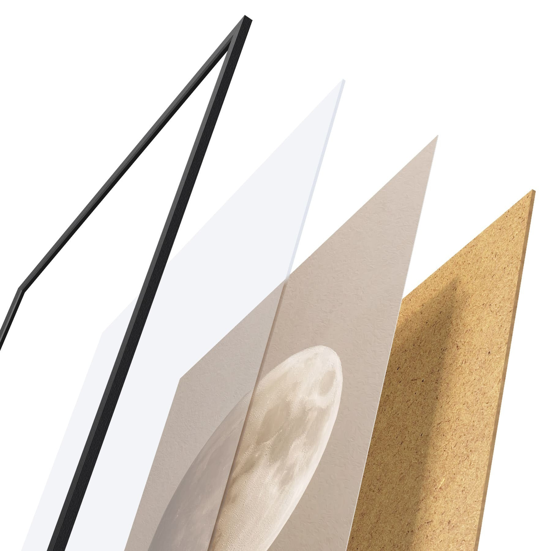 Plakat składa się z ramy, pleksi, wydrukowanego obrazu i podkładu z płyty wiórowej. Plakat można natychmiast zawiesić na ścianie dzięki uchwytom z tyłu.