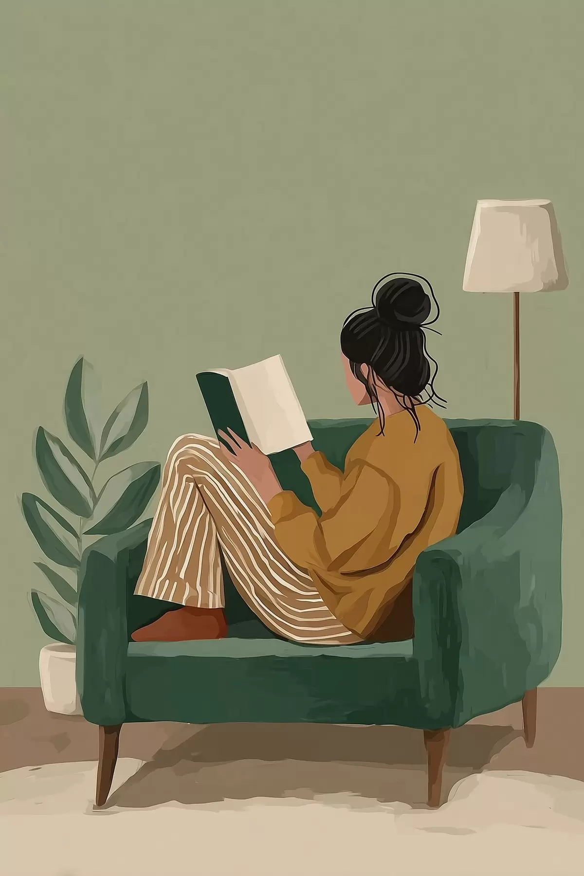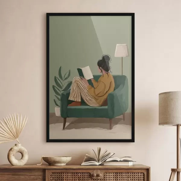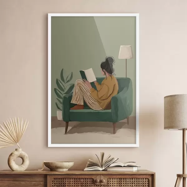 Poster minimalistyczna, przytulna ilustracja kobiety siedzącej w fotelu i czytającej książkę Nr f48118