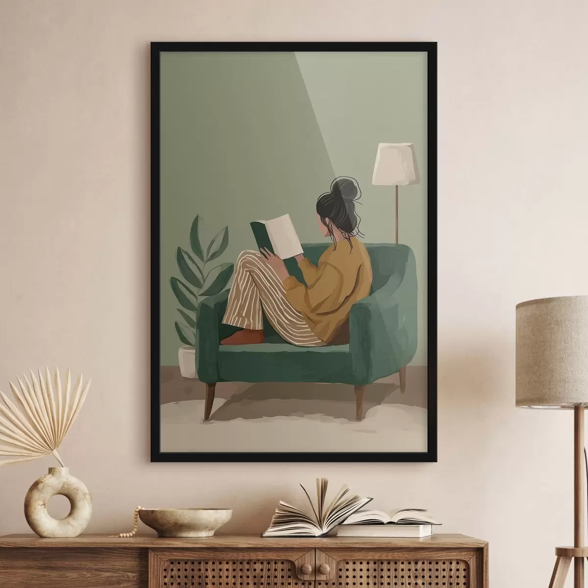 Plakat minimalistyczna, przytulna ilustracja kobiety siedzącej w fotelu i czytającej książkę f48118