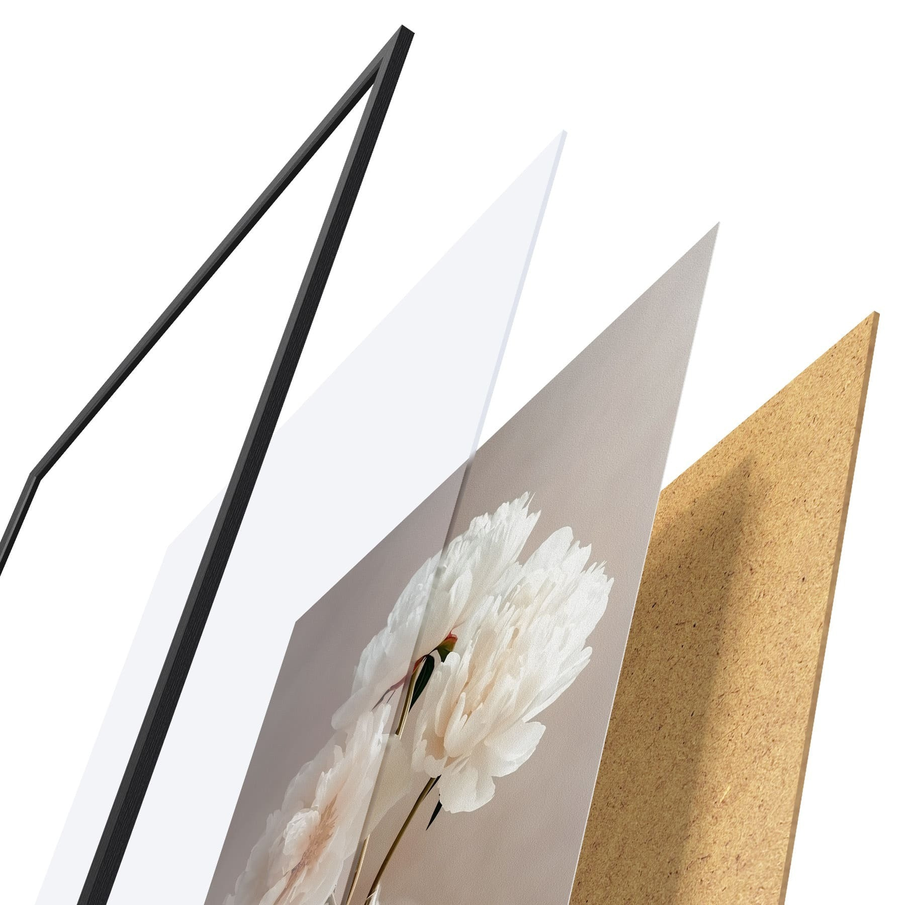 Plakat składa się z ramy, pleksi, wydrukowanego obrazu i podkładu z płyty wiórowej. Plakat można natychmiast zawiesić na ścianie dzięki uchwytom z tyłu.