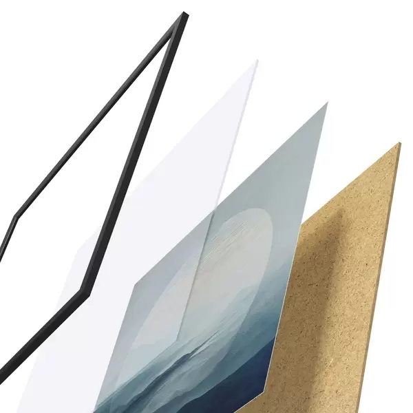 Plakat składa się z ramy, pleksi, wydrukowanego obrazu i podkładu z płyty wiórowej. Plakat można natychmiast zawiesić na ścianie dzięki uchwytom z tyłu.