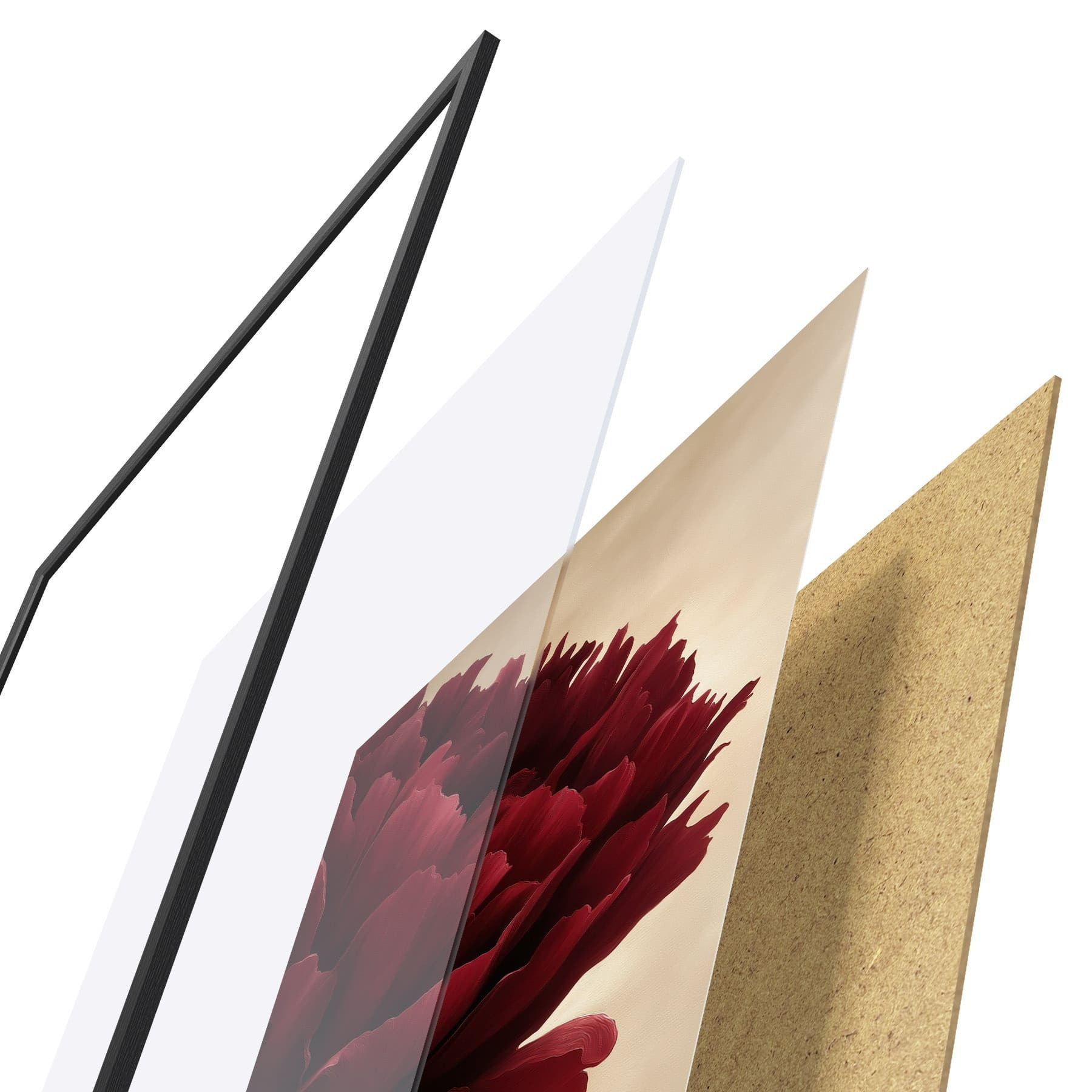 Plakat składa się z ramy, pleksi, wydrukowanego obrazu i podkładu z płyty wiórowej. Plakat można natychmiast zawiesić na ścianie dzięki uchwytom z tyłu.