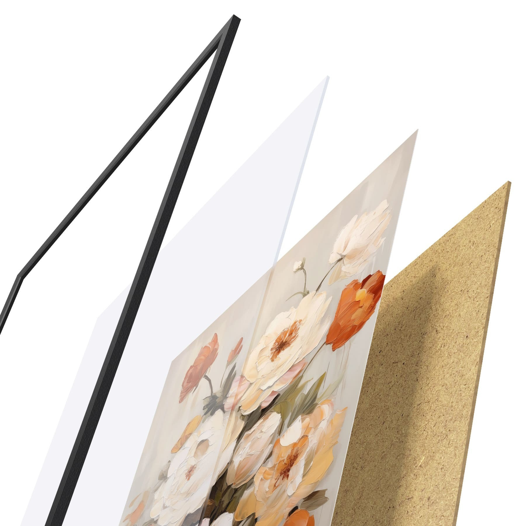Plakat składa się z ramy, pleksi, wydrukowanego obrazu i podkładu z płyty wiórowej. Plakat można natychmiast zawiesić na ścianie dzięki uchwytom z tyłu.