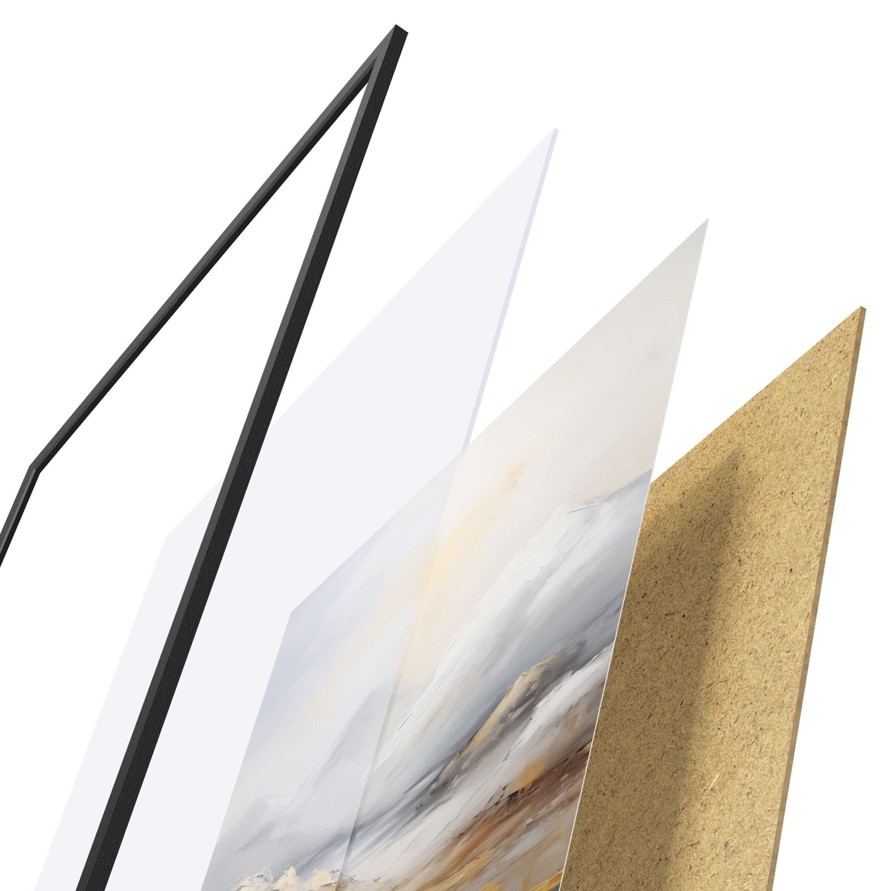 Plakat składa się z ramy, pleksi, wydrukowanego obrazu i podkładu z płyty wiórowej. Plakat można natychmiast zawiesić na ścianie dzięki uchwytom z tyłu.