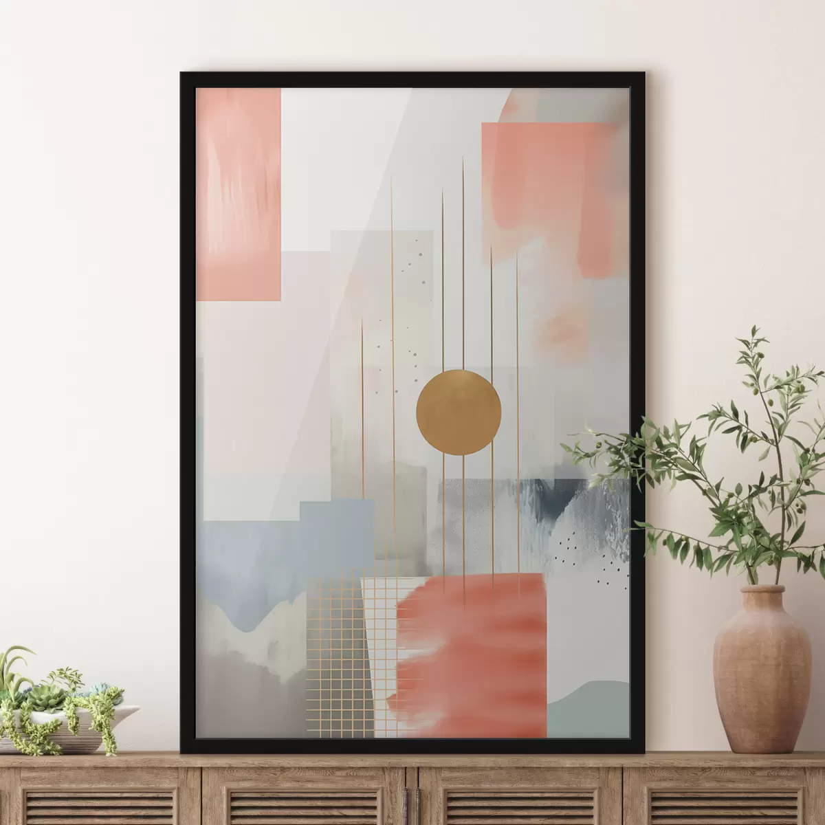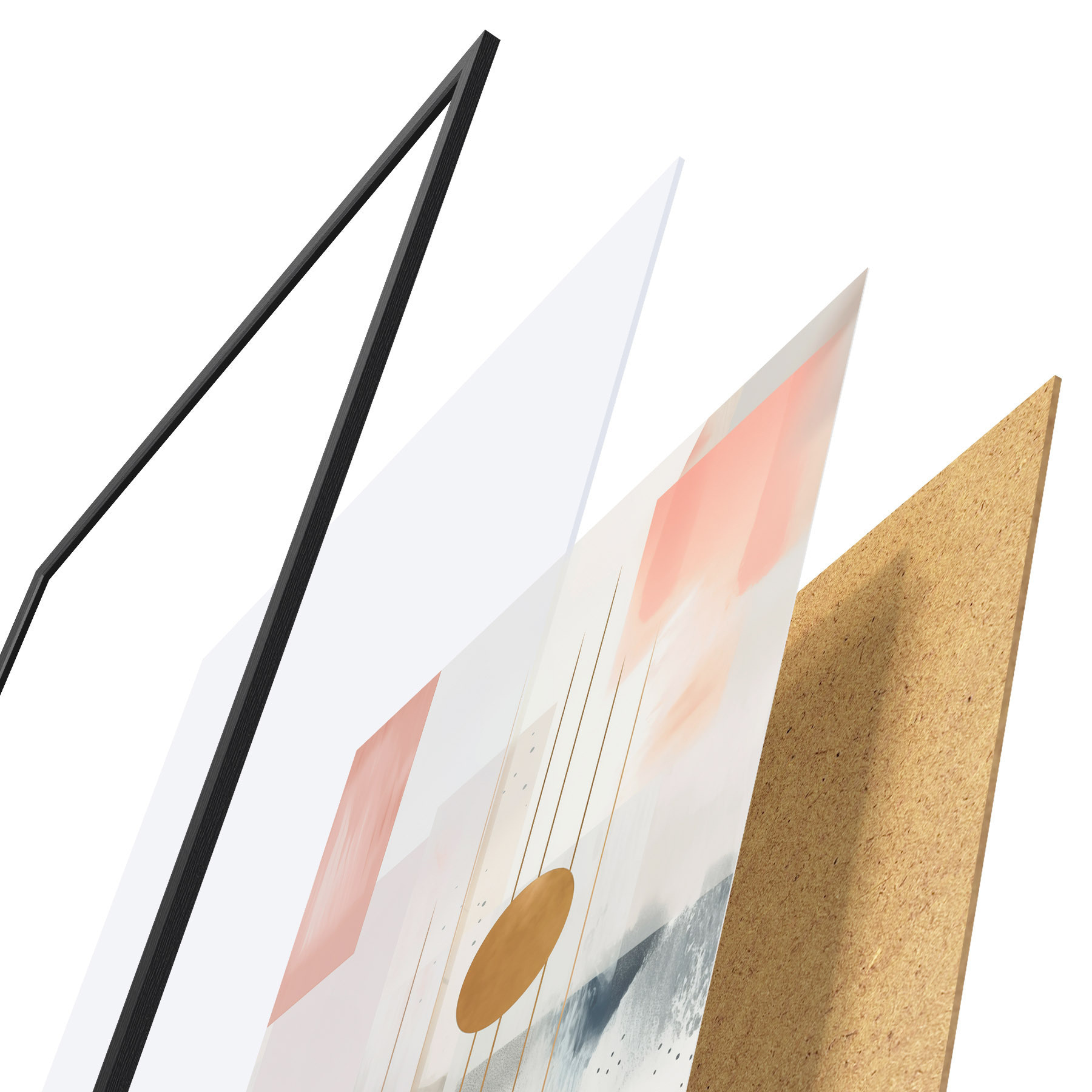 Plakat składa się z ramy, pleksi, wydrukowanego obrazu i podkładu z płyty wiórowej. Plakat można natychmiast zawiesić na ścianie dzięki uchwytom z tyłu.