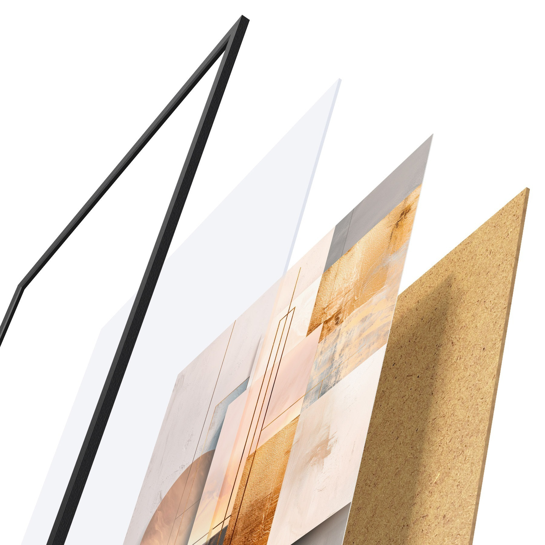 Plakat składa się z ramy, pleksi, wydrukowanego obrazu i podkładu z płyty wiórowej. Plakat można natychmiast zawiesić na ścianie dzięki uchwytom z tyłu.
