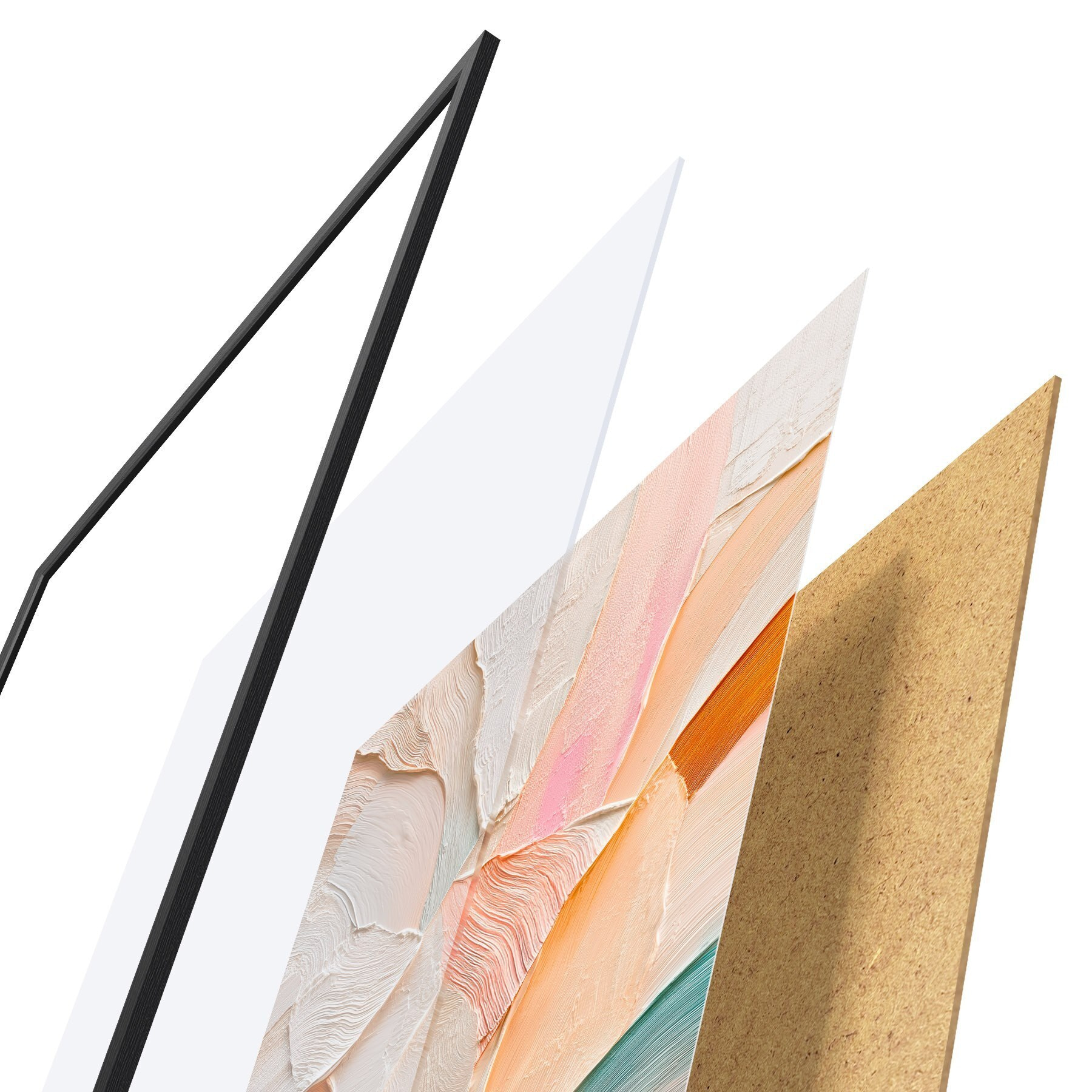 Plakat składa się z ramy, pleksi, wydrukowanego obrazu i podkładu z płyty wiórowej. Plakat można natychmiast zawiesić na ścianie dzięki uchwytom z tyłu.