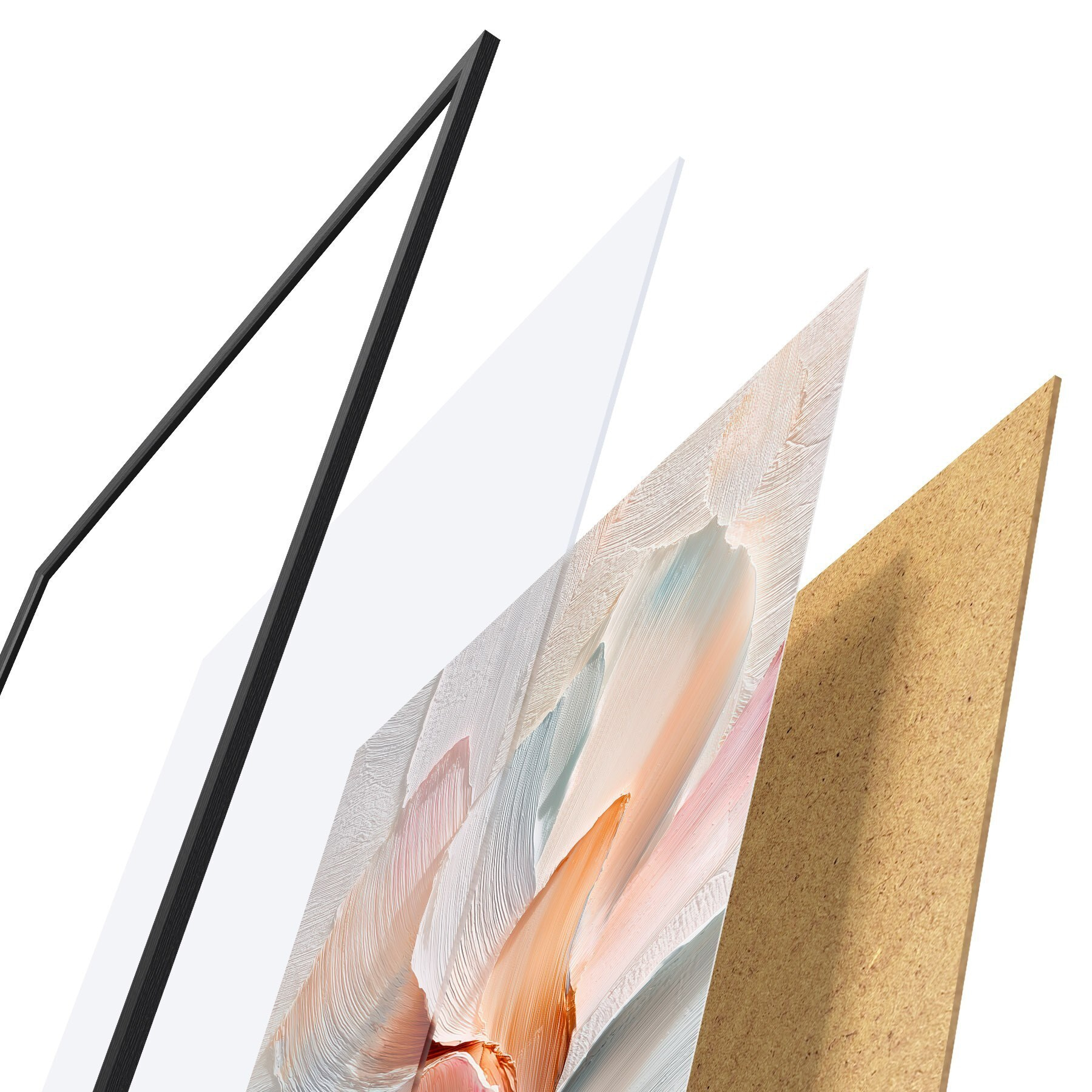 Plakat składa się z ramy, pleksi, wydrukowanego obrazu i podkładu z płyty wiórowej. Plakat można natychmiast zawiesić na ścianie dzięki uchwytom z tyłu.
