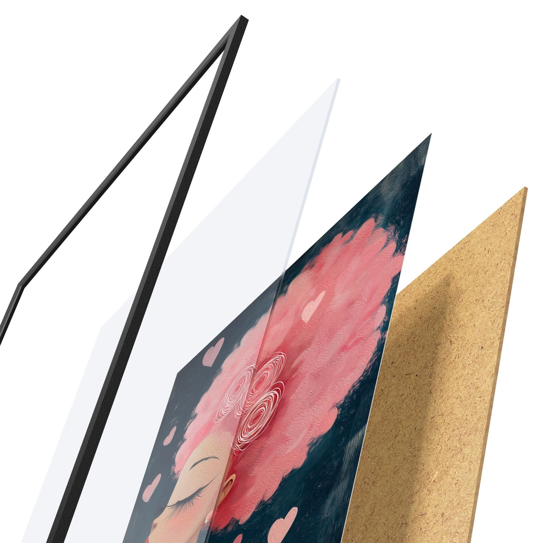 Plakat składa się z ramy, pleksi, wydrukowanego obrazu i podkładu z płyty wiórowej. Plakat można natychmiast zawiesić na ścianie dzięki uchwytom z tyłu.