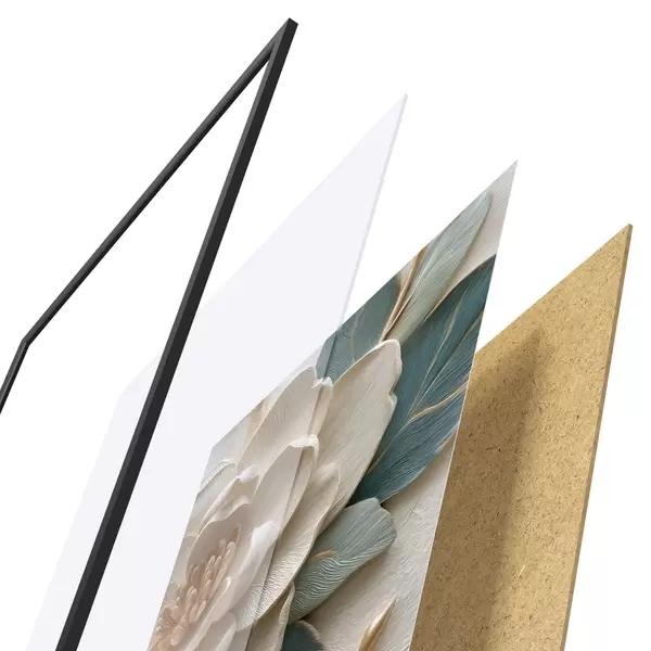 Plakat składa się z ramy, pleksi, wydrukowanego obrazu i podkładu z płyty wiórowej. Plakat można natychmiast zawiesić na ścianie dzięki uchwytom z tyłu.