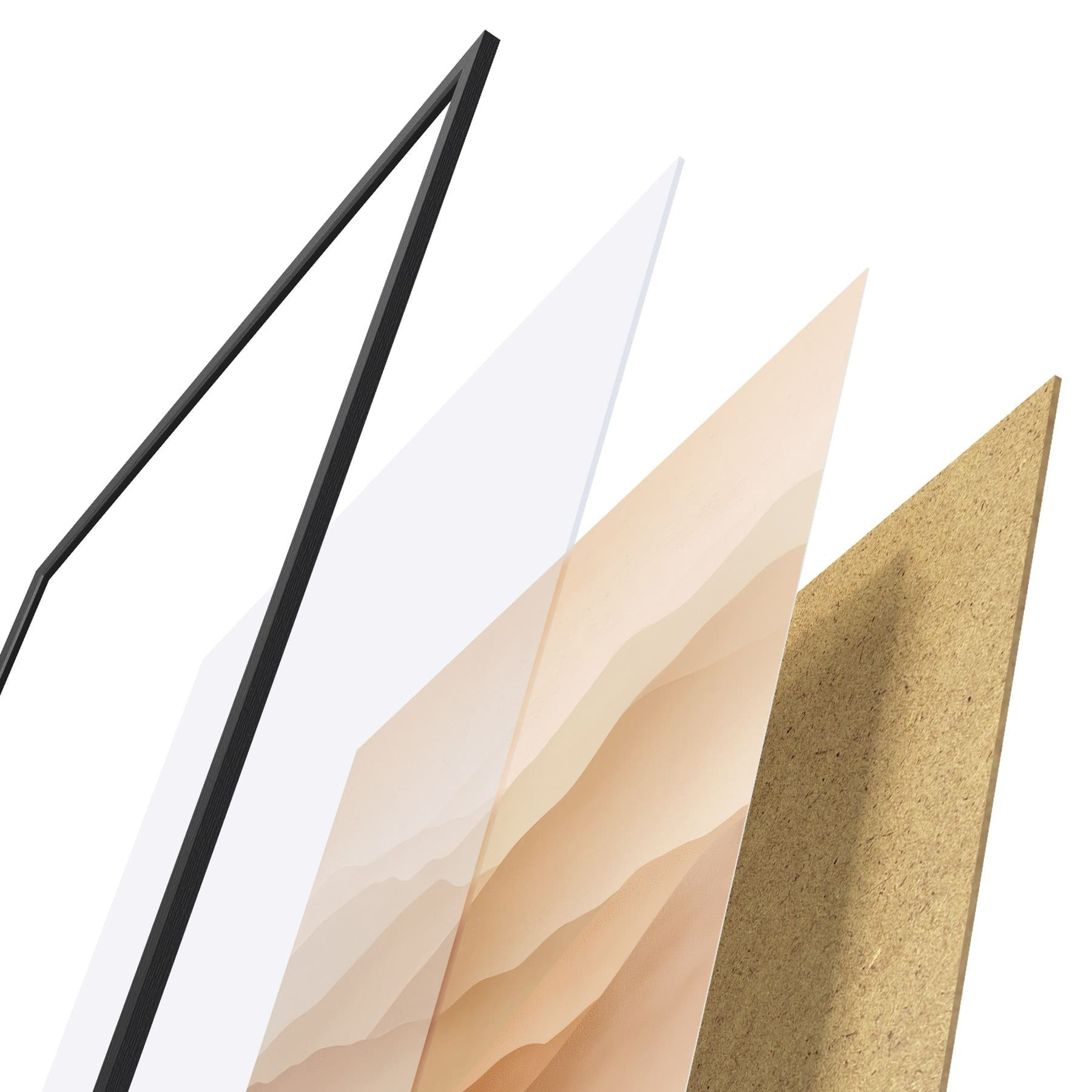 Plakat składa się z ramy, pleksi, wydrukowanego obrazu i podkładu z płyty wiórowej. Plakat można natychmiast zawiesić na ścianie dzięki uchwytom z tyłu.