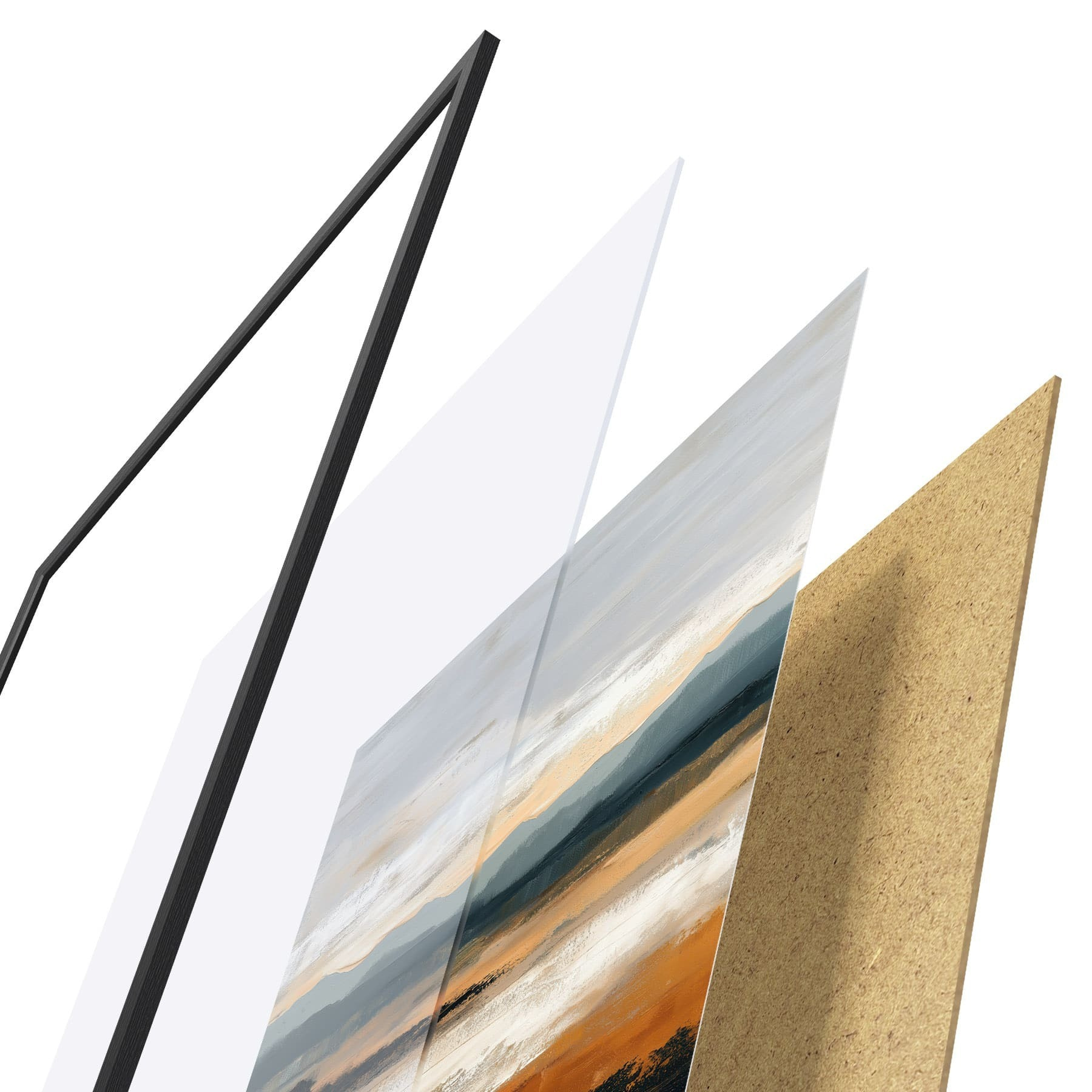 Plakat składa się z ramy, pleksi, wydrukowanego obrazu i podkładu z płyty wiórowej. Plakat można natychmiast zawiesić na ścianie dzięki uchwytom z tyłu.