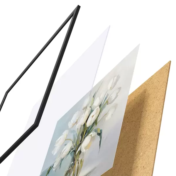 Plakat składa się z ramy, pleksi, wydrukowanego obrazu i podkładu z płyty wiórowej. Plakat można natychmiast zawiesić na ścianie dzięki uchwytom z tyłu.