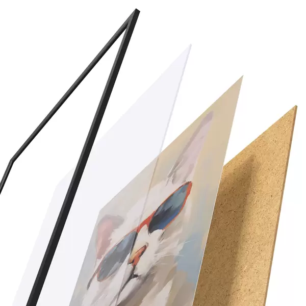 Plakat składa się z ramy, pleksi, wydrukowanego obrazu i podkładu z płyty wiórowej. Plakat można natychmiast zawiesić na ścianie dzięki uchwytom z tyłu.