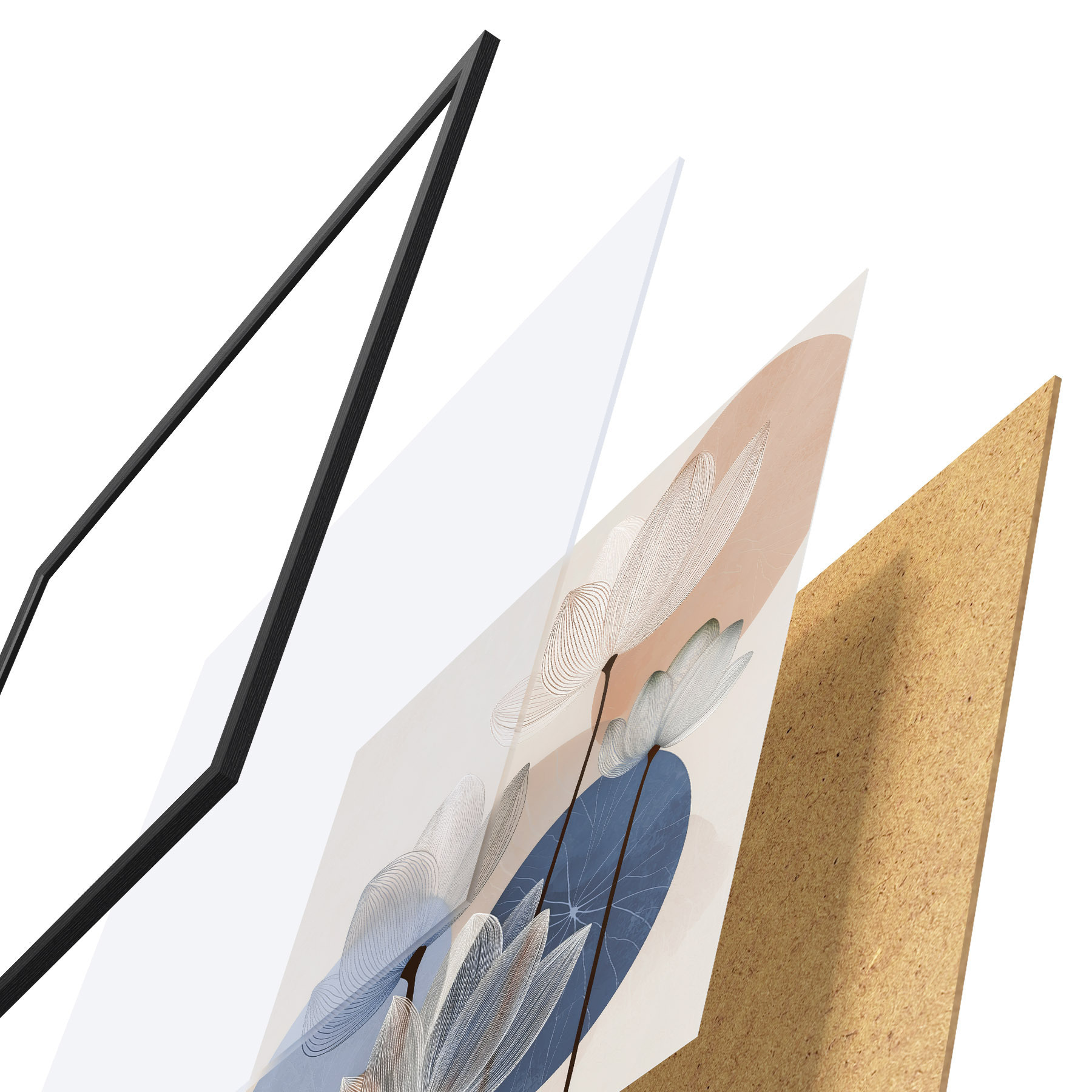 Plakat składa się z ramy, pleksi, wydrukowanego obrazu i podkładu z płyty wiórowej. Plakat można natychmiast zawiesić na ścianie dzięki uchwytom z tyłu.
