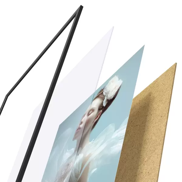 Plakat składa się z ramy, pleksi, wydrukowanego obrazu i podkładu z płyty wiórowej. Plakat można natychmiast zawiesić na ścianie dzięki uchwytom z tyłu.
