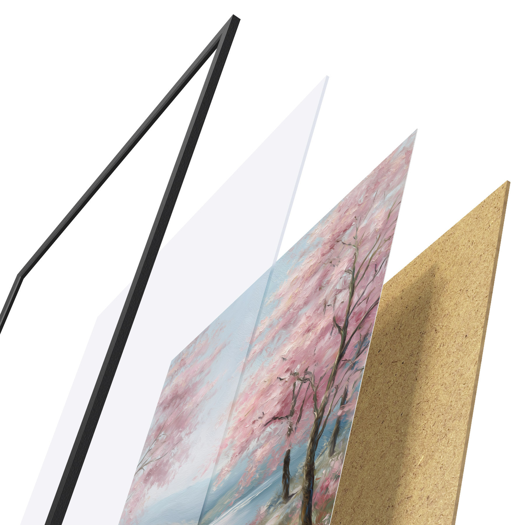 Plakat składa się z ramy, pleksi, wydrukowanego obrazu i podkładu z płyty wiórowej. Plakat można natychmiast zawiesić na ścianie dzięki uchwytom z tyłu.